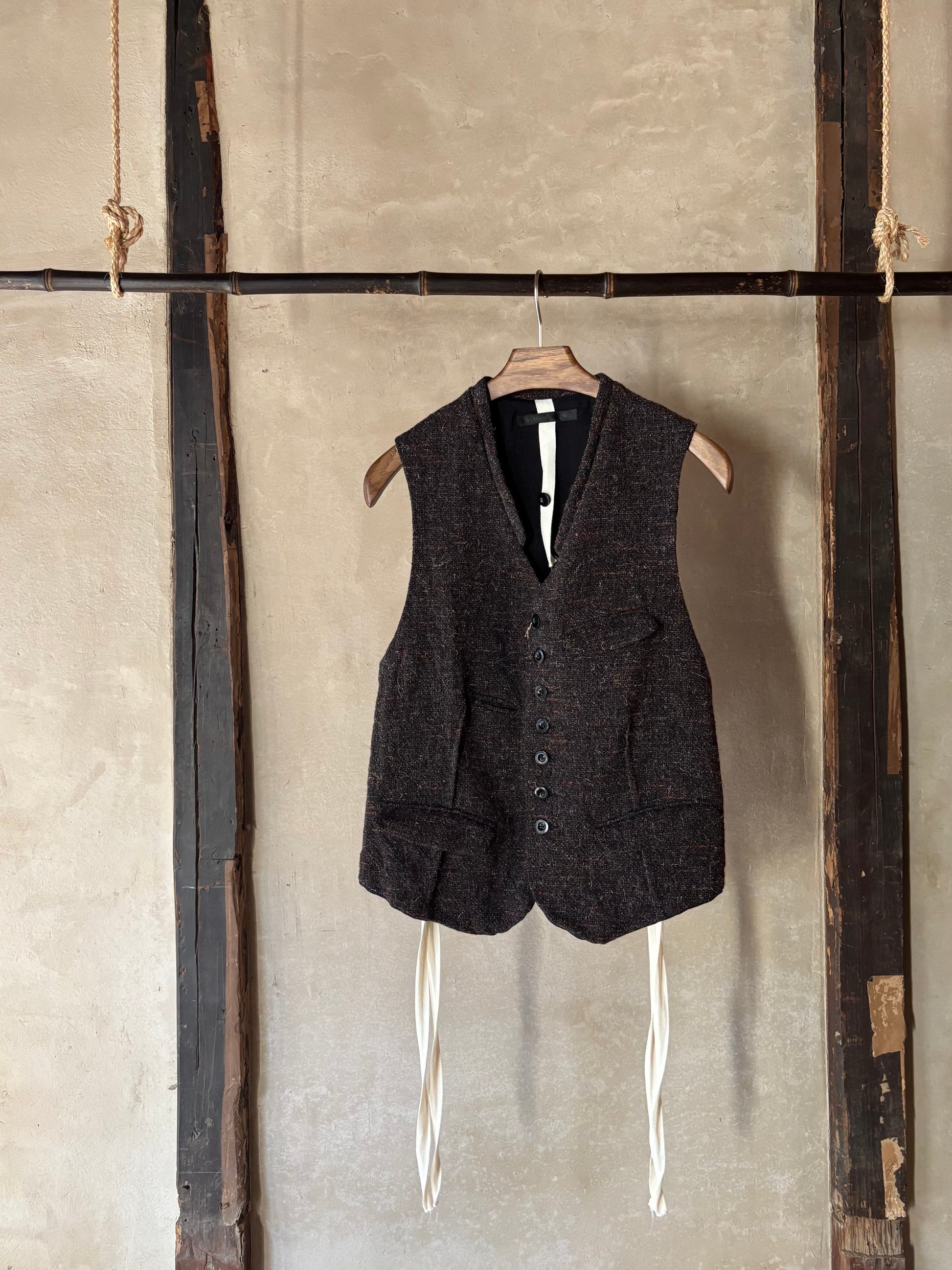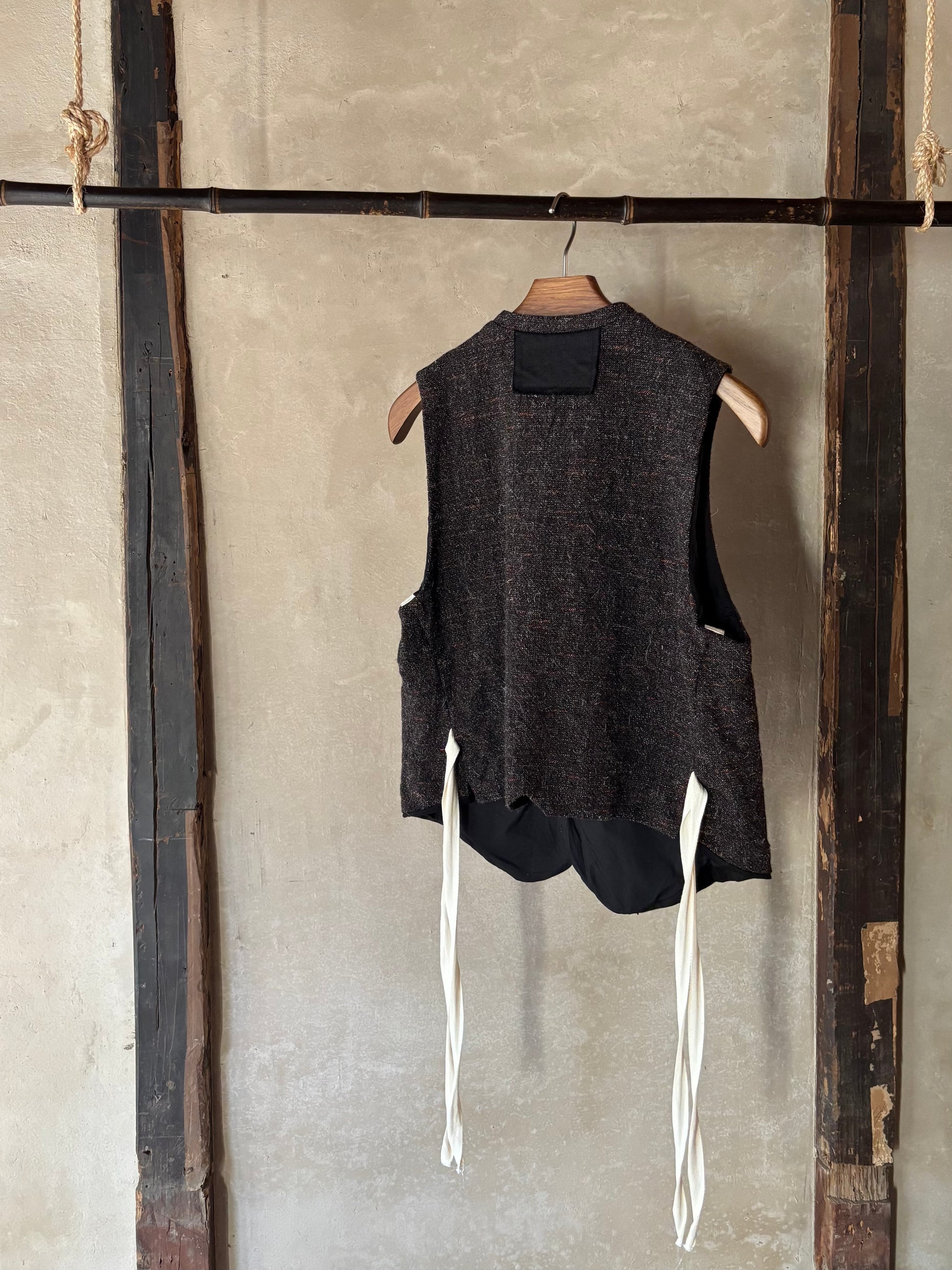 レイヤードスタイルに最適な、ルーズフィットのギレット。ニットウェアとの相性も抜群です。6本のコットンストリングが遊び心をプラス。クラシックとアバンギャルドが出会う、ユニークなパターンデザインが特徴です。