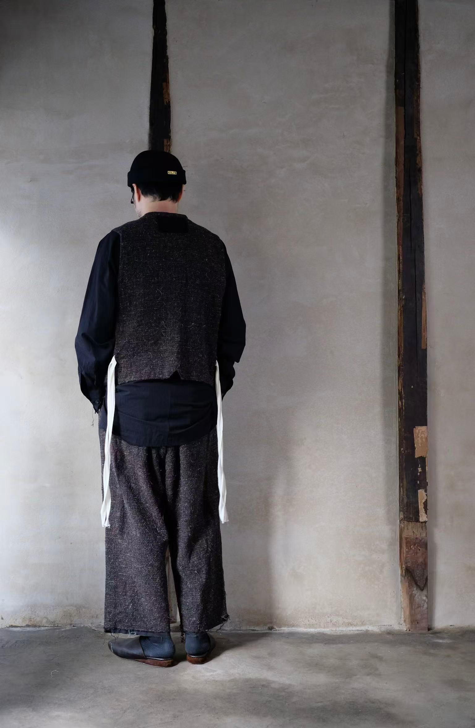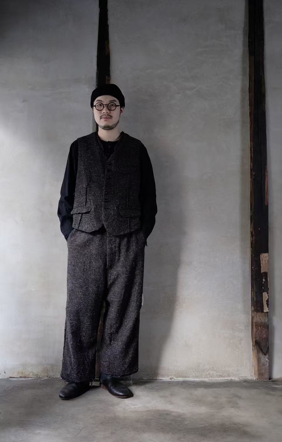 素材の名は「Re Generated Kemp Mixed Tweed」です。尾州で織り上げられたこのMix Brownの素朴な生地は、過去の試作サンプルを基に、1/6ケンプから1/10スラブコットン配合へと進化させ、ヴィンテージの風合いと現代の着やすさを両立させました。