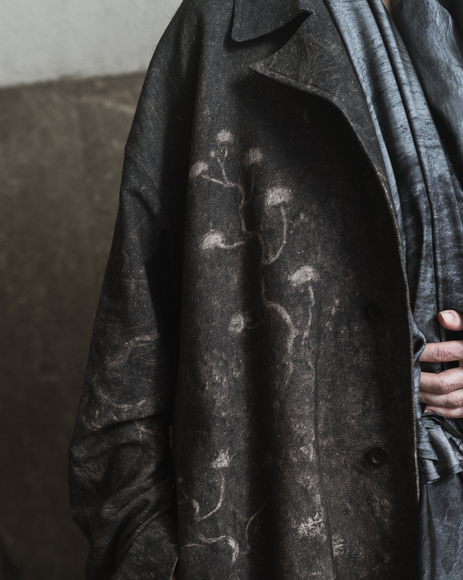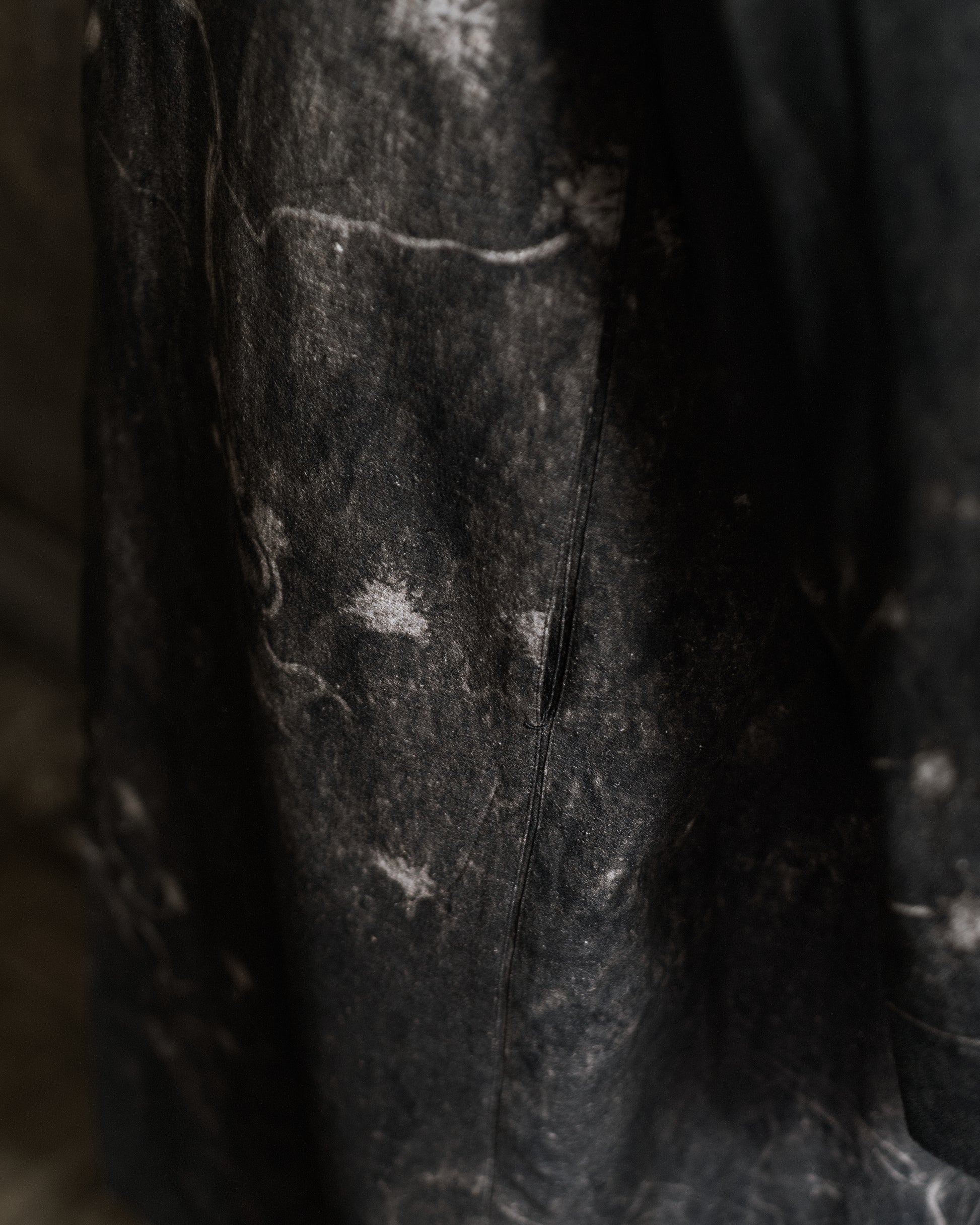 今回、nouchi 別注として特別に、裏地には「山染め (mountain dyed)」によるシルクが採用されている。Mountain dye(山染め)とは、中国・貴州省に暮らす少数民族・トン族に伝わる古い染色技法。彼らは山野にある植物を拾い集め、それを用いて衣を染め上げる。Stovaigh は彼らを訪ね、デザイナーの故郷・四川産のシルクを託し、ただ作品の裏地のた