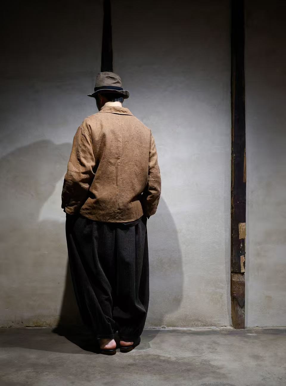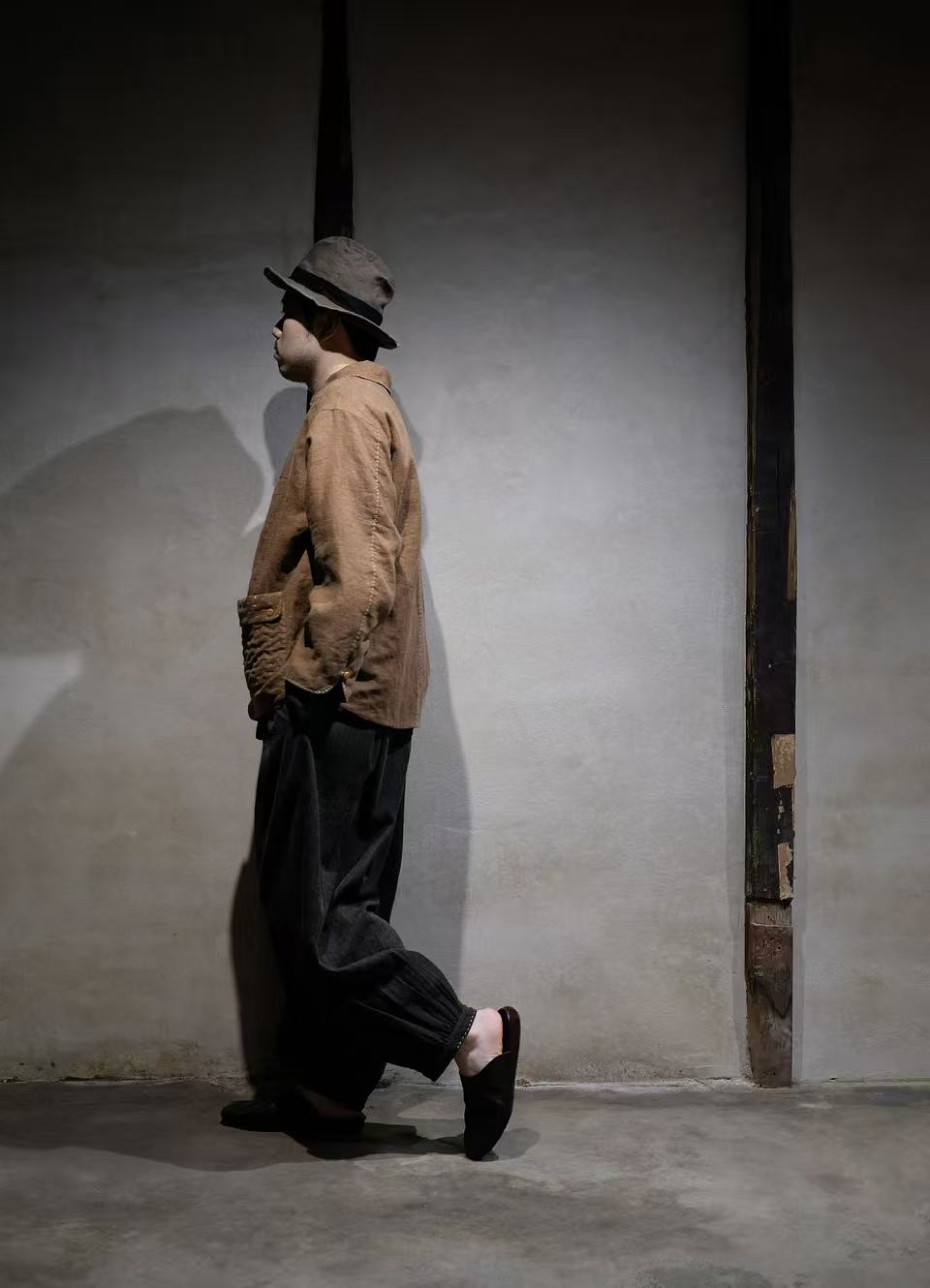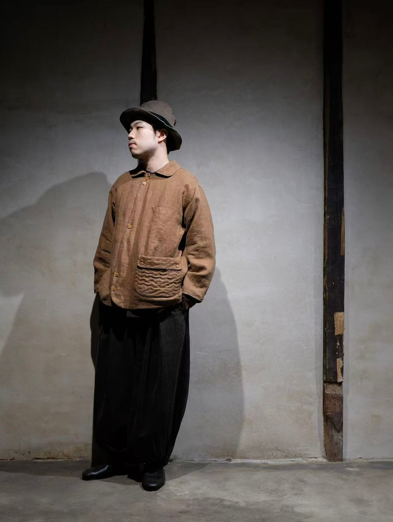 デザイナー・Hunger Renによる特注香雲紗(こううんしゃ)です。中国広東省の老舗工房にて、伝統的な香云紗と同様の染色技法を施して仕上げられた100%リネン素材です。今回は、生地の裏側である「薯莨(しょりょう)」の面を採用する。表面には従来通りの泥染め加工が施されているため、染色過程で泥が裏面の薯莨色に部分的に滲み込み、「透莨(とうりょう)」と呼ばれる独特の斑模様が生まれます。この自然な色の滲みこそが本物の香云紗の証であり、麻本来の通気性と泥染めによるしなやかな肌触りを兼ね備えた、特別仕様となっています。