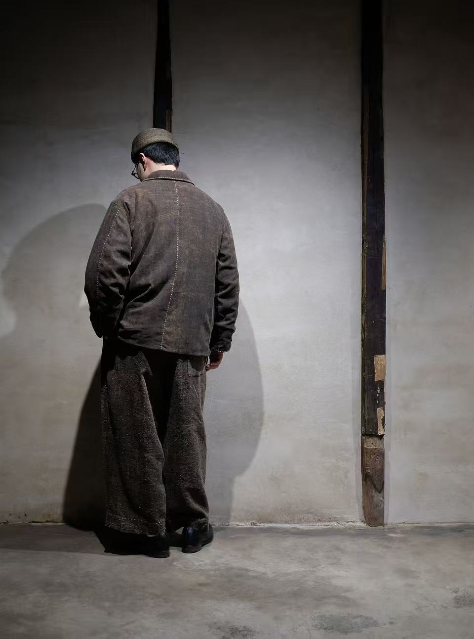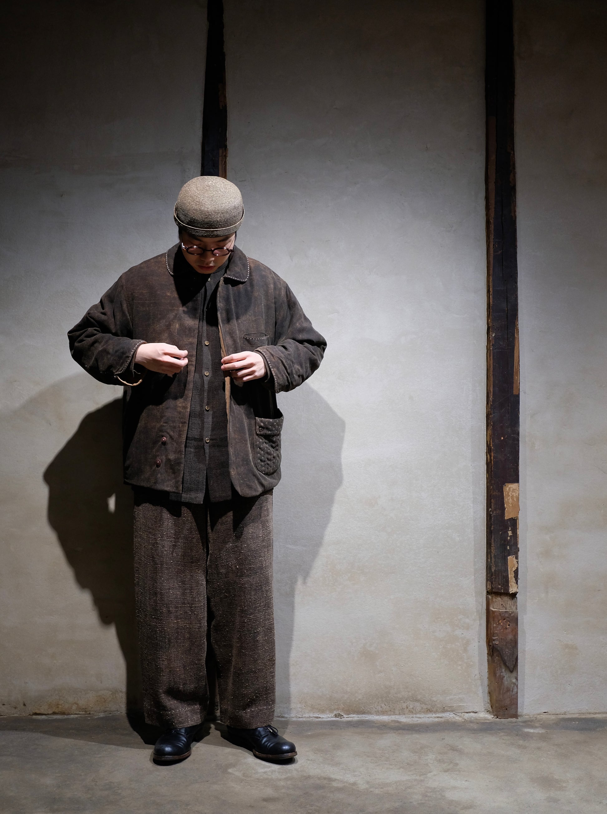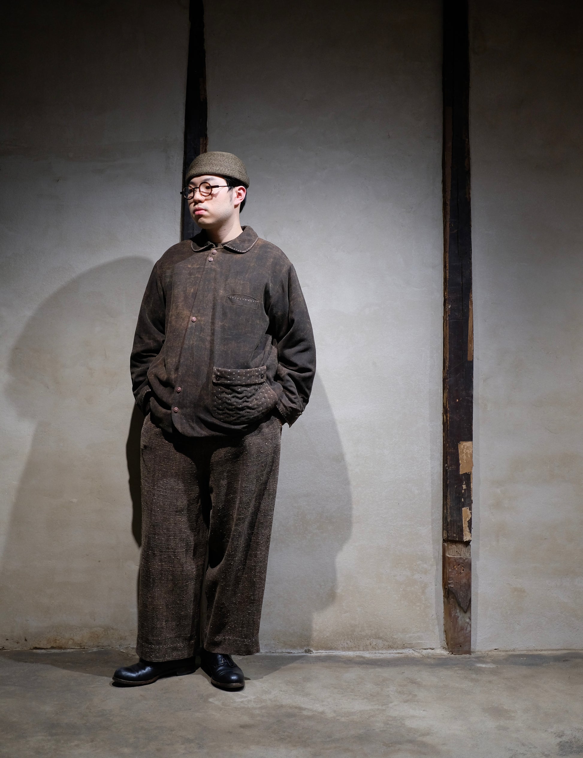 長い年月を経て、泥染めの茶色がほどよく褪せた、ムラ感のあるデッドストックの香雲紗(シルク)を使う。アウターとして使うため、香雲紗の中でも希少な厚手の生地を採用しています。着用を重ねるにつれ、布地の中で特に摩擦が多い部分からは、表面の茶色(泥染め)が徐々に褪せ、下層のオレンジ色(薯莨染め)が浮かび上がってきます。年月の経過とともに味わい深く変化していく様子を楽しめる、まさに"経年変化を体感できる"特別な布地なのです。裏地には羊毛100%をキルティング加工した高級仕様を採用。優れた保温性を保ちつつ、従来の綿素材よりも軽量なのが特徴です。