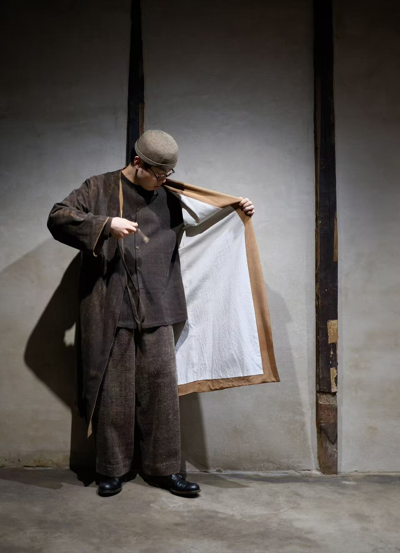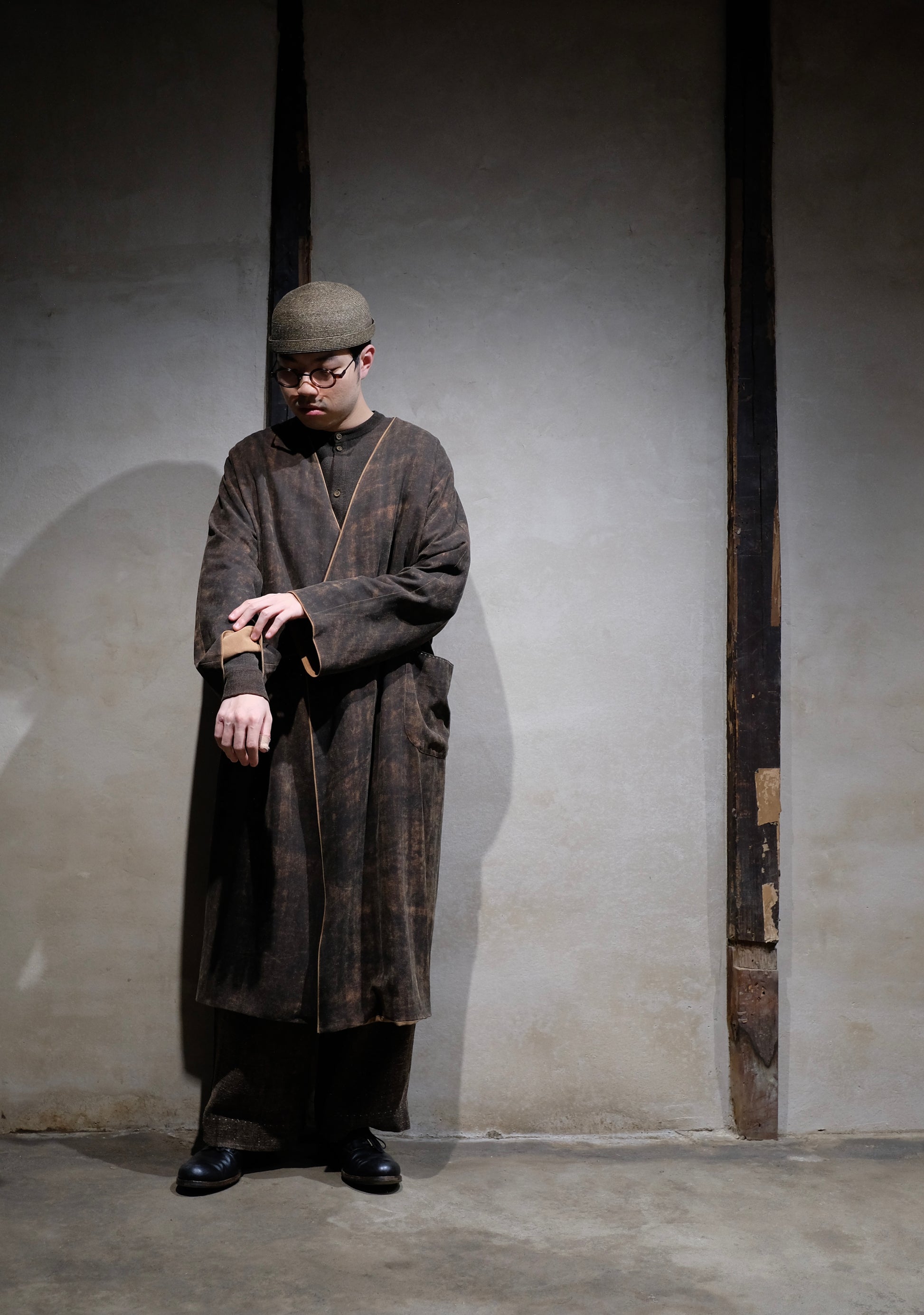 長い年月を経て、泥染めの茶色がほどよく褪せた、ムラ感のあるデッドストックの香雲紗(シルク)を使う。アウターとして使うため、香雲紗の中でも希少な厚手の生地を使用しています。着用を重ねるにつれ、布地の中で特に摩擦が多い部分からは、表面の茶色(泥染め)が徐々に褪せ、下層のオレンジ色(薯莨染め)が浮かび上がってきます。年月の経過とともに味わい深く変化していく様子を楽しめる、まさに"経年変化を体感できる"特別な布地なのです。裏地は生成りのオーガニックコットン地を採用。